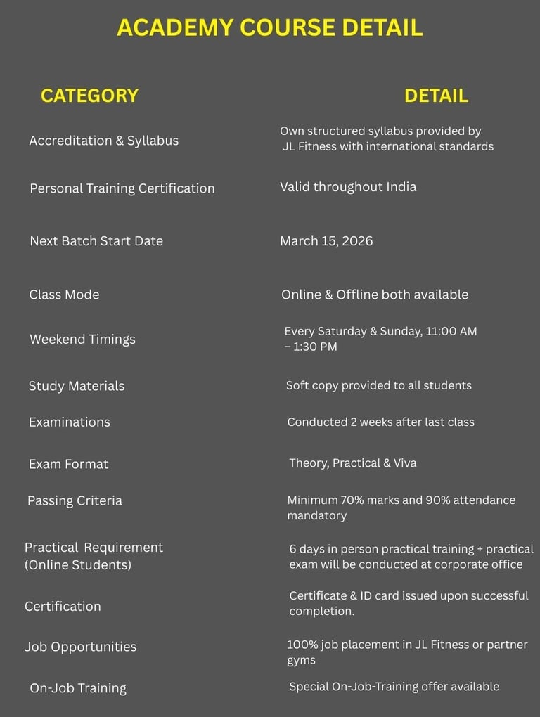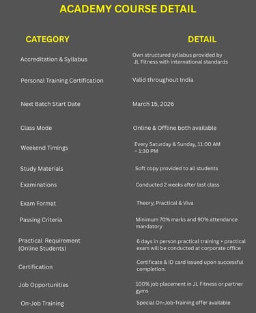 At JL FITNESS Academy, we empower fitness enthusiasts to become certified pros through hands-on courses and expert guidance.